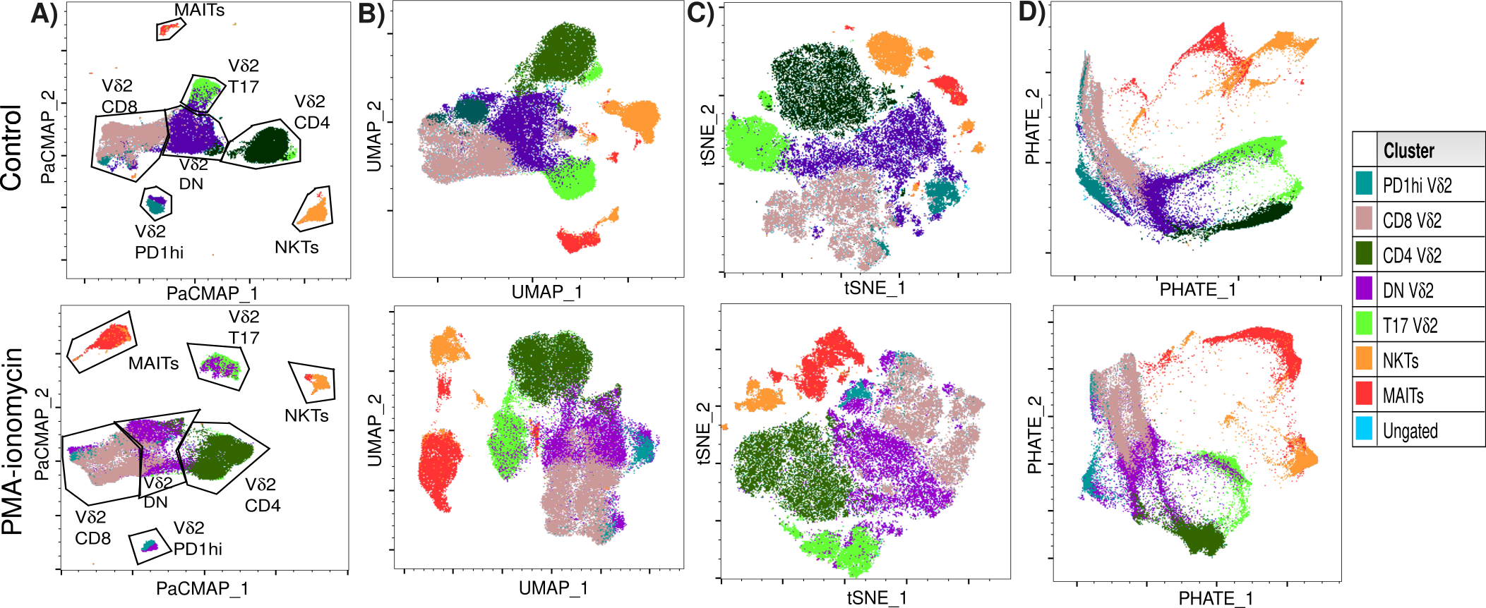Week 18: For this session, we explore how dimensionality visualization algorithms perform tSNE and UMAP in R using our raw and unmixed samples. In the process, we will explore how markers included, number of cells, and presence of bad quality events can impact the final visualizations. Finally, we will provide an overview of how to link to Python to additionally run PaCMAP and PHATE visualizations for use in R.
